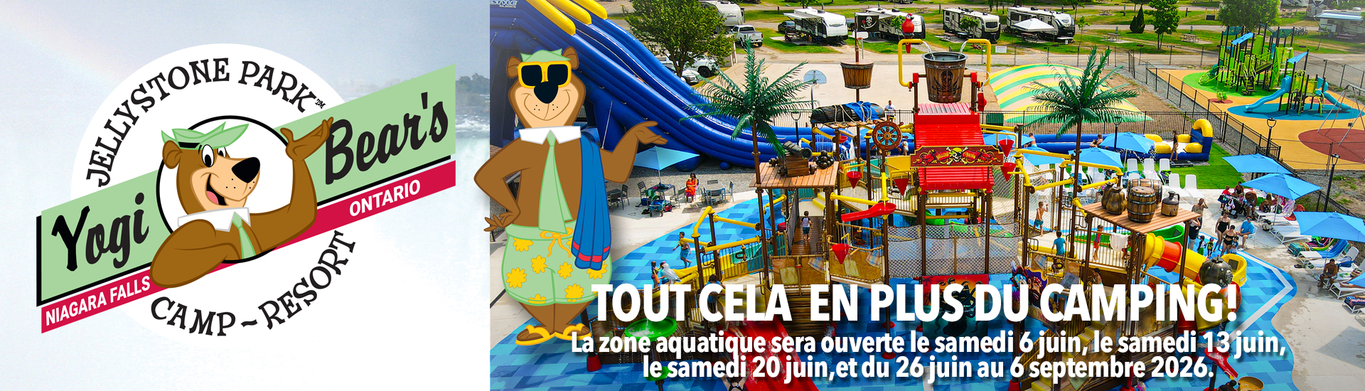 CHAQUE INVITÉ ENREGISTRÉ À JELLYSTONE PARK™ NIAGARA, RECEVRA UN BRACELET D’ACCÈS À LA ZONE AQUATIQUE TOUT COMPRIS, INCLUANT L'UTILISATION DE LA PISCINE, DE LA GLISSADE D’EAU GÉANTE ET DU TERRAIN DE JEUX AQUATIQUE !