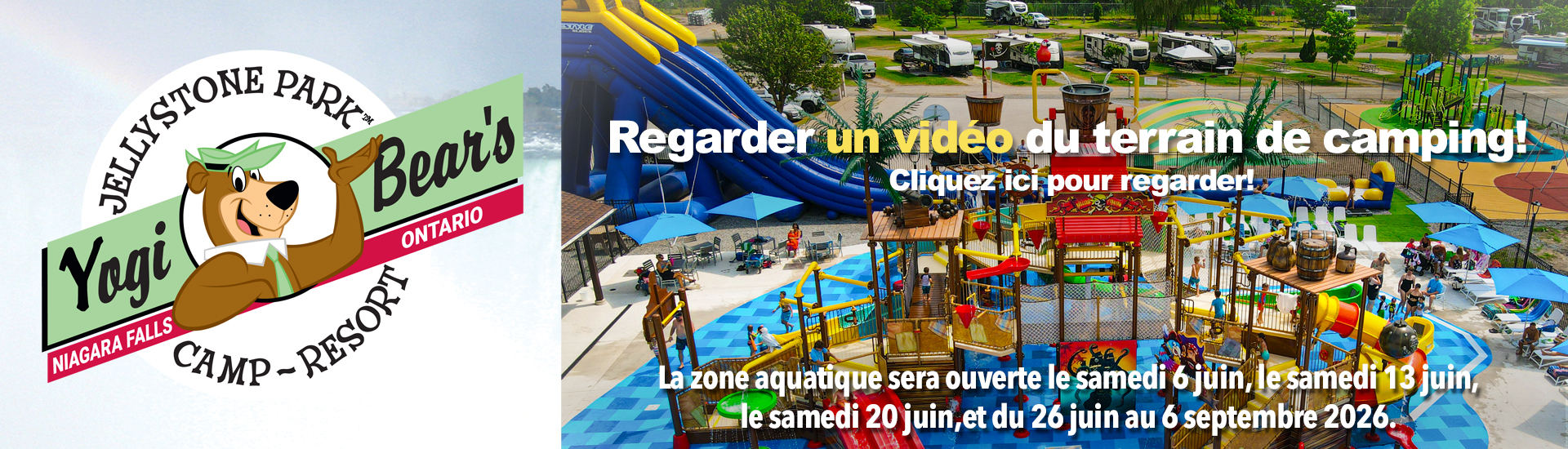 Jellystone Park™ Niagara a un site parfait pour vous! Nous pouvons accueillir les tentes roulottes, les motorisés, ou les roulettes de n’importe quelle taille. Les campeurs peuvent profiter des grands sites d’herbes avec un foyer, une table de pique-nique et vous êtes proche de toutes les commodités du parc.