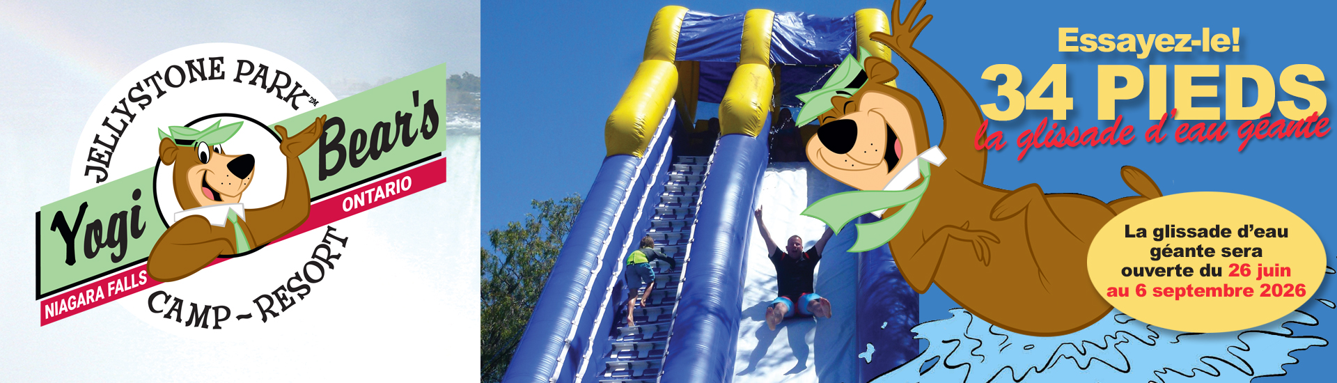 Lorsque vous visitez Jellystone Park™ Niagara, vous, votre famille et vos amis pouvez profiter de tous les commodités au parc tel que la piscine chauffée, un géant glissade d’eau, un terrain de jeux, un trampoline gonflable et plus!